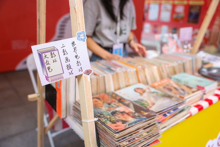 有人沿着市集漫步,20余个精心布置的文创摊位各具特色,从限量版影视周边、珍藏胶片到联名文创产品,再到融入电影元素的特色美食,每个摊位都巧妙地将电影艺术与生活美学相融合,每个摊主都喜笑颜开。“电影之城”的官方周边6个小时内卖出了超过2000元,“最好看的那两款托特包都卖完了”;旧电影杂志也卖得超乎预期的好,“明年一定还来”;“这个可更换海报的大光明冰箱贴今天首发,我们带了一百个来,快卖完了。”现场除了丰富多彩的演艺活动,还特别设置了影迷节周边兑换点,已完成Movie Walk打卡任务的影迷可就地领取主题帆布袋、纪念票根等限定文创纪念品。“大家热情好高,15个章才能换一个帆布包,今天一个下午我们起码发掉了600个帆布包。”工作人员说,很累,但很开心,很满足,“因为我们就希望通过一个专属影迷的节日,让每一位热爱电影的人都化身成为这座电影之城的主角。”