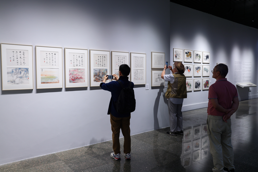 朱屺瞻创作完成的《浮想小写》十二幅引人驻足。 文汇报记者 叶辰亮摄