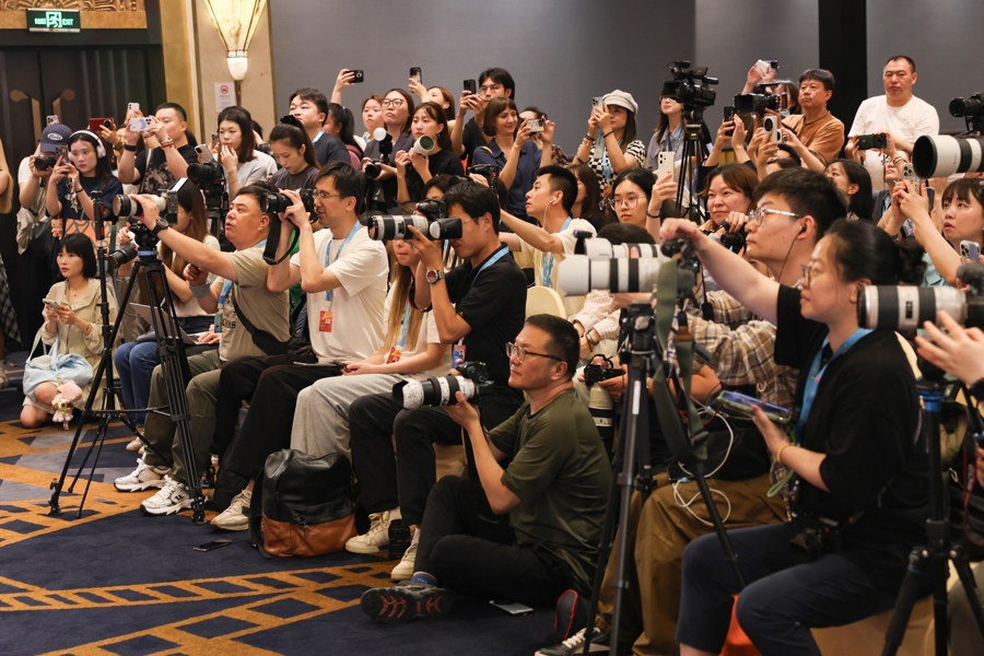 第27届上海国际电影节金爵奖评委媒体见面会现场的媒体记者。