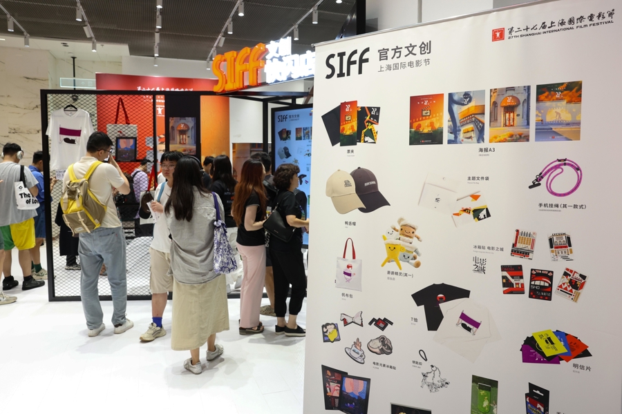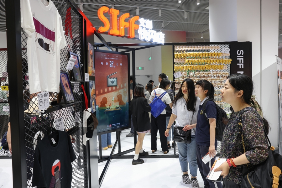 影迷在上海影城的电影节文创售卖区选购电影节文创。