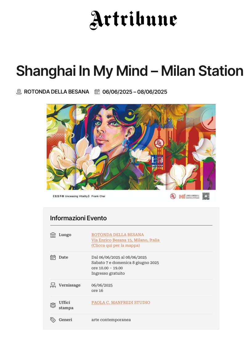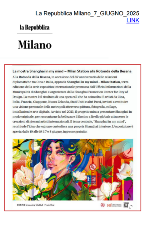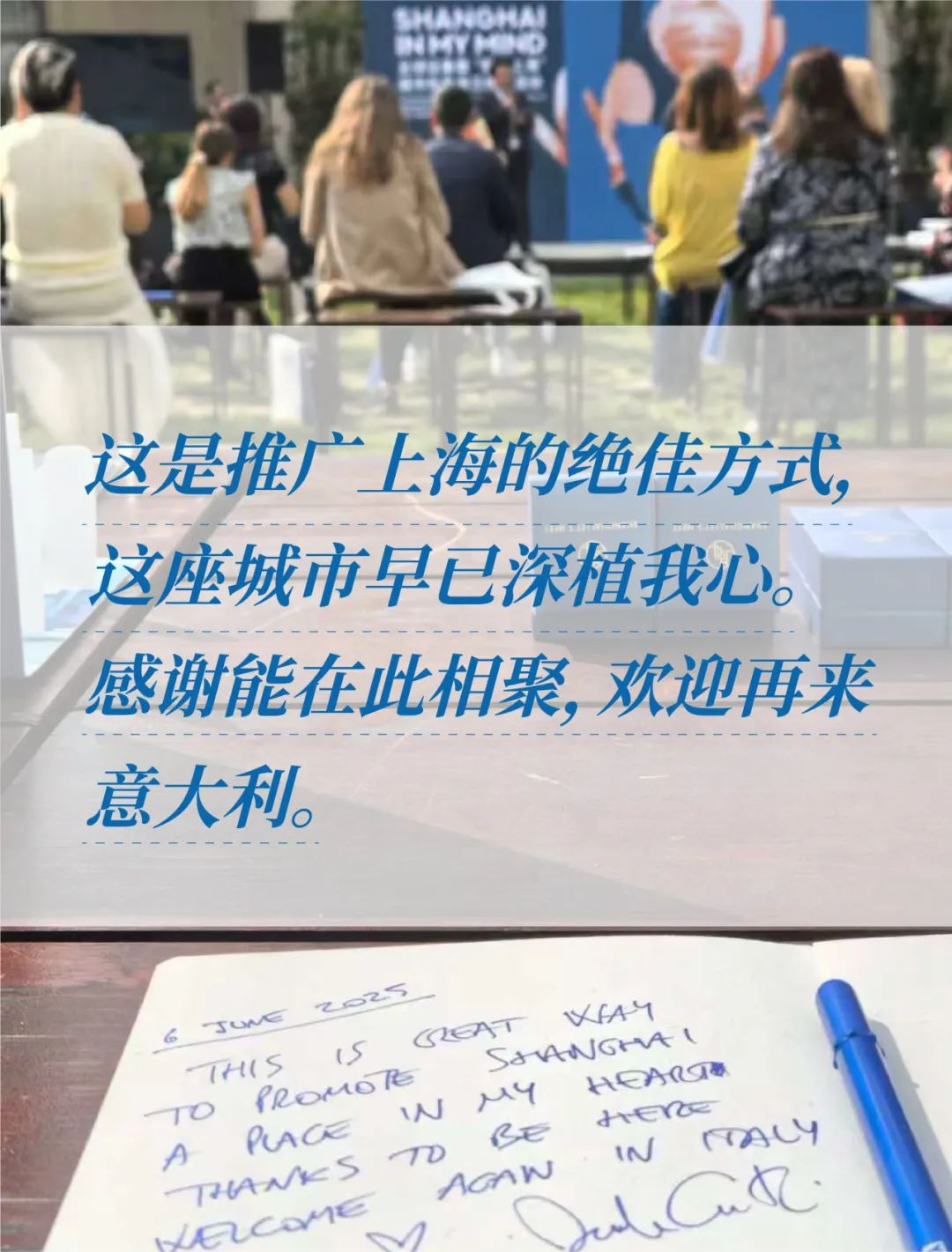 2025年6月6日-8日,《SHANGHAI IN MY MIND全球征集》第三季暨“魅力上海”城市形象推广活动(即“SHANGHAI IN MY MIND”米兰活动)在米兰历史文化地标贝萨纳圆厅成功举办。作为中意建交55周年系列活动之一,米兰活动由上海市政府新闻办公室联合上海设计之都促进中心共同举办,成为当地新晋网红打卡点,引发海外网友热评“这就是我眼中的上海:一座开放的国际化都市,却也不失温情”。活动还获得了225家欧美媒体关注报道,充满“想去上海看看”的期待。