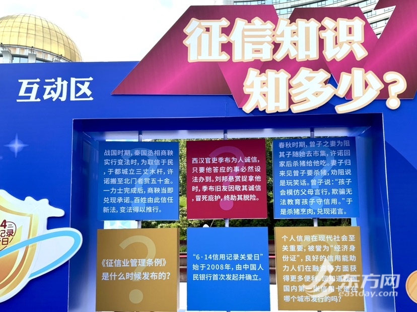 东方网记者柏可林6月14日报道:6月14日是我国第18个“信用记录关爱日”,“6·14信用记录关爱日”宣传活动在上海南京东路步行街世纪广场举行,向社会公众普及征信知识和征信文化。