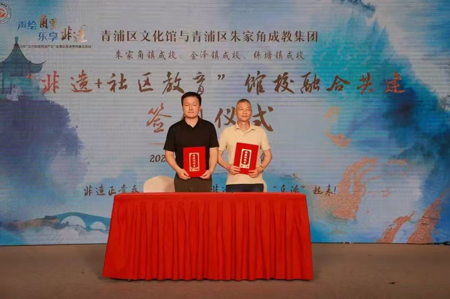 活动当天,青浦区文化馆与青浦区朱家角成教集团共同签署“非遗+社区教育”馆校融合共建协议,共同推进“非遗在社区”工作,共建青浦非遗社区教育新生态。