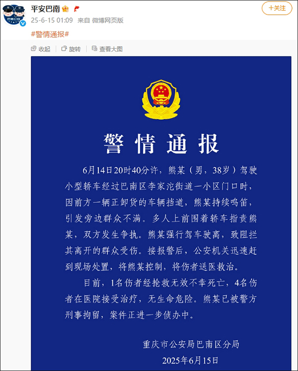 6月15日,重庆市公安局巴南区分局官方微博@平安巴南 发布警情通报称,6月14日20时40分许,熊某(男,38岁)驾驶小型轿车经过巴南区李家沱街道一小区门口时,因前方一辆正卸货的车辆挡道,熊某持续鸣笛,引发旁边群众不满。多人上前围着轿车指责熊某,双方发生争执。熊某强行驾车驶离,致阻拦其离开的群众受伤。接报警后,公安机关迅速赶到现场处置,将熊某控制,将伤者送医救治。