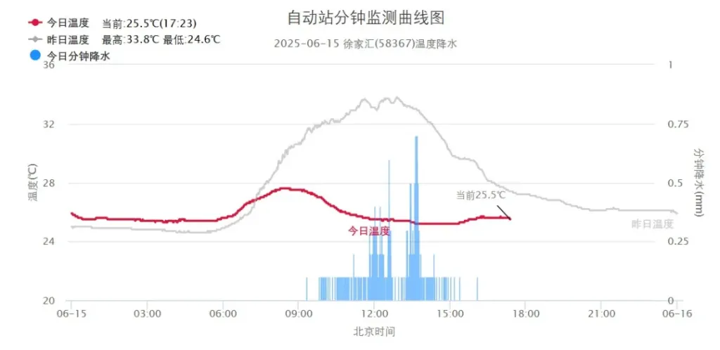 今天(6月15日)清晨有网友反馈,阳光短暂上线。好景不长,受高空槽和台风“蝴蝶”减弱后低压环流共同影响,今天上午很快转阴有阵雨或雷雨的天气。上海中心气象台先后发布了雷电黄色和暴雨蓝色预警信号,目前两个预警信号都已解除。全市中部和南部地区雨势明显。今天00时到16时的雨量统计显示,金山吕巷镇63.4毫米为最大。今天徐家汇站最高气温出现在早晨,为27.6℃,雨中气温逐渐走低,闷热感明显减弱。