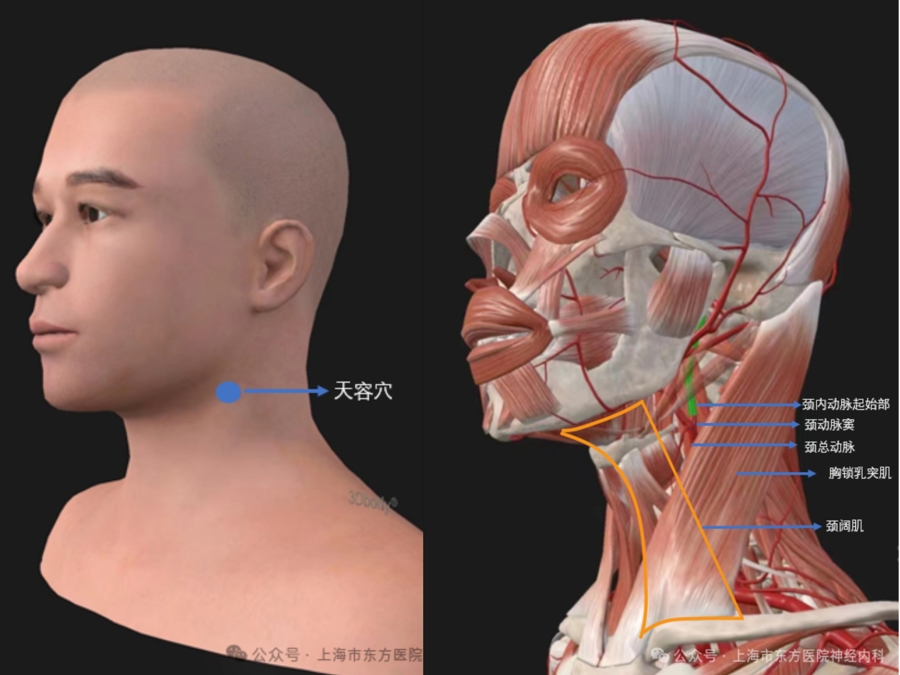 颈动脉位置较浅,其中颈动脉窦是最容易受伤并形成斑块的部位。颈动脉窦位于颈动脉三角内,其体表位置在天容穴(颈前区的下颌角后方)附近。如果进行大力度和幅度的揉捏、按压、牵拉、扭转等操作,很容易损伤该段动脉内壁,高速冲击的血流在颈动脉窦分叉,血液中携带的脂肪就很容易在伤口处形成斑块。