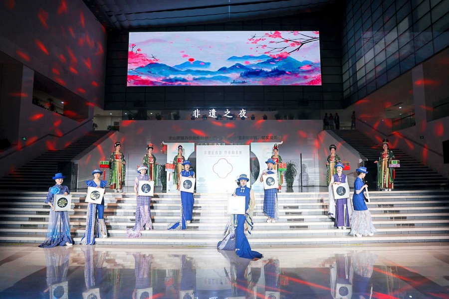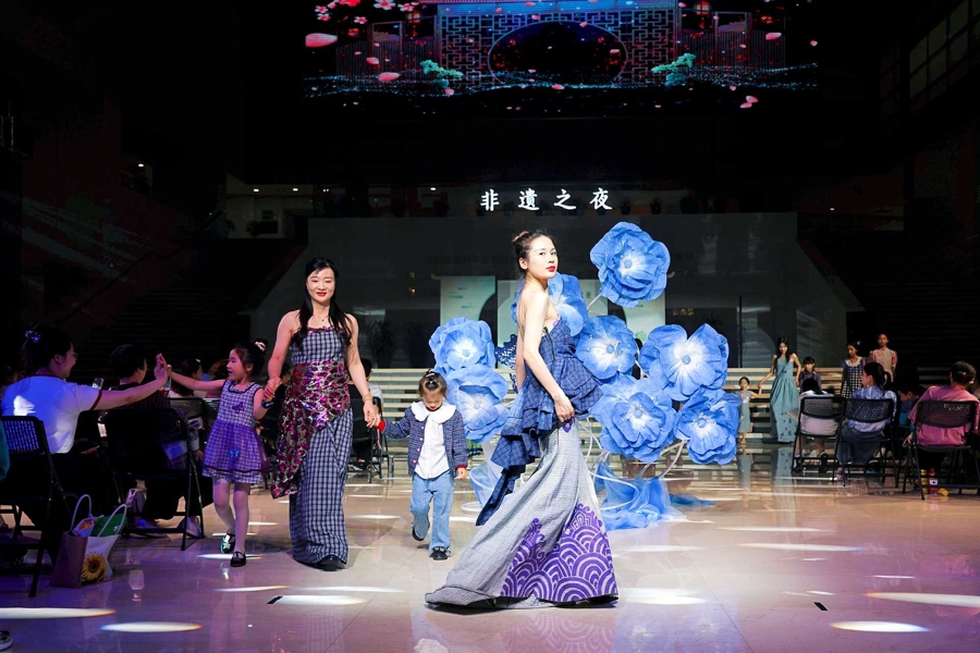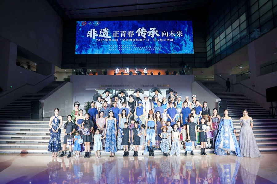 与此同时,“非遗之夜”非遗时尚秀演精彩上演。明清服饰、创意扎染、传统汉服、海派旗袍......一场传统服饰与非遗跨界融合的时尚秀演在金山区博物馆登场。模特身着特色服饰惊艳亮相,沉浸式T台成为非遗潮流展示地,成为全场焦点,非遗焕发出青春活力与时尚魅力。