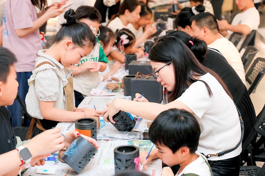 活动当天,“非遗里的金山——非遗美育课堂”人气满满,盘扣体验与扎染体验乐趣无穷,黑陶体验与版画体验古韵盎然,古琴艺术体验与宋代点茶体验雅趣共生,农民画夜灯体验和非遗漆扇体验人气爆棚,现场气氛热烈。一位参与者表示,非遗美育融入现代生活,就是最好的传承。