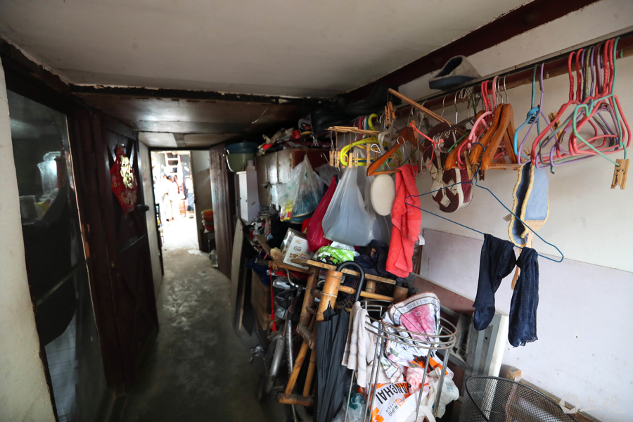 21平方米的房间用木板隔成两间,前间以前是婆婆和儿子睡的,后间无窗只能放下一张床一只橱,是夫妻俩休息的地方。楼板透水,墙粉都掉下来,只能用纸糊。
