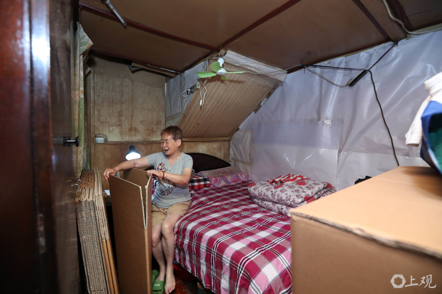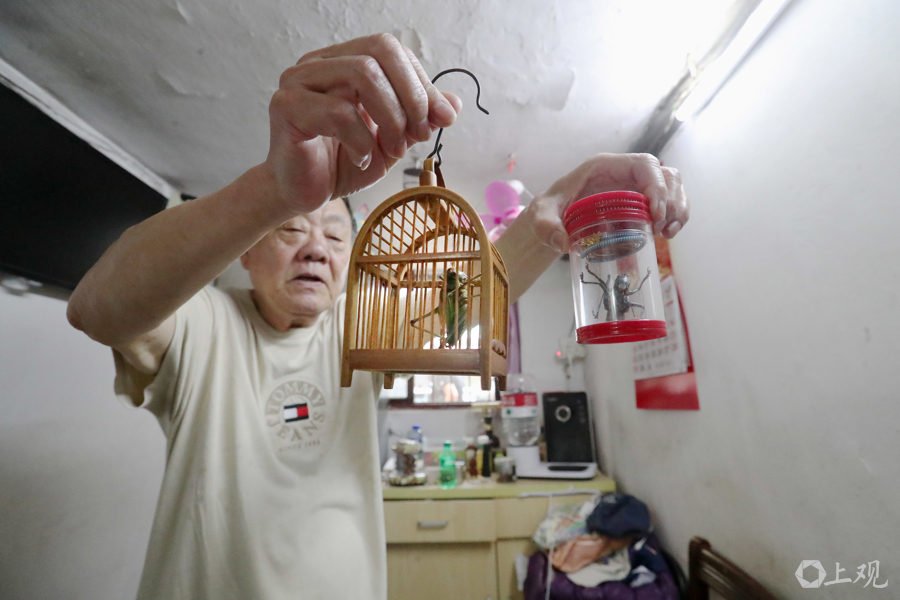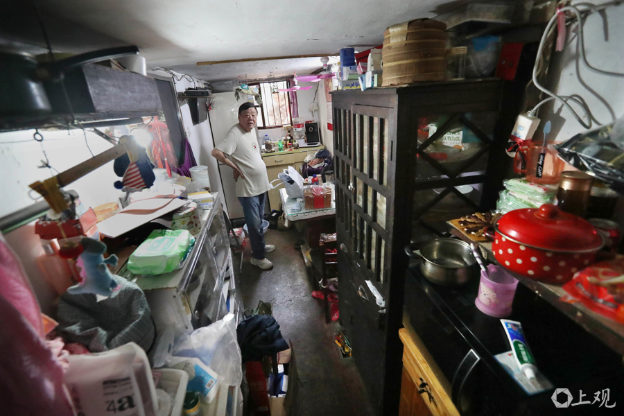 走进老顾的房子,蝈蝈声萦绕耳畔,这是他最大的乐趣。家里只有7平方米呈狭长型,夫妻俩和女儿都挤在这里。两边家具一放,中间只能走一个人,每件家具顶上都堆满了物品。遇上黄梅季,地面潮得厉害。