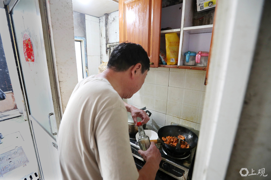 6月16日早上8点半,74岁的顾先生在“厨房”烹制一道油爆虾。这是他给当天搬家的邻居韩国友夫妇送上的,“看看这色味,祝老邻居的新生活红红火火,甜甜蜜蜜。”