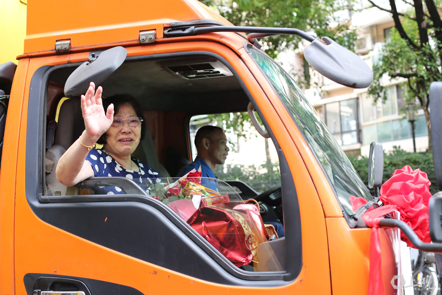 海防路449号居民姚玉兰坐上搬场车,难掩喜悦。