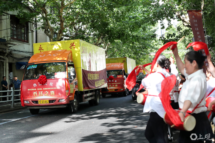 当日,静安区海防路、新丰路、西康路零星旧改项目举行集中搬场仪式,绑着大红花的搬场车衬着居民的笑靥格外喜庆。截至目前,签约比例为99.22%。
