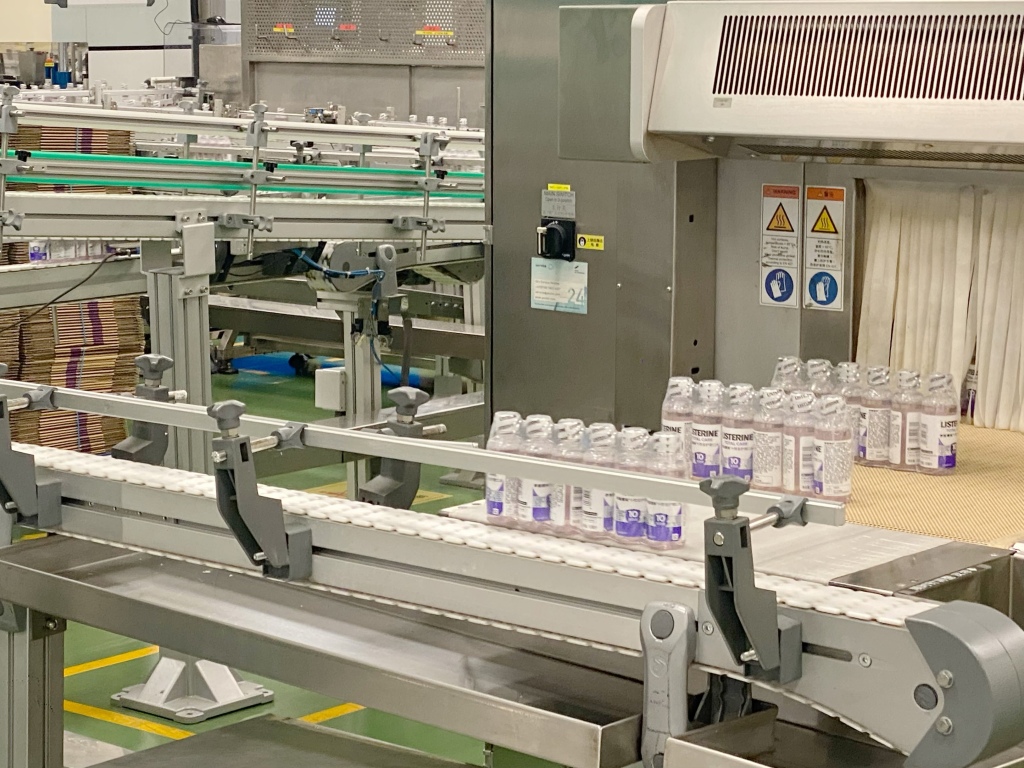 16日下午,澎湃新闻参观了位于闵行开发区的李施德林漱口水生产线。生产线上,漱口水从混合、吹瓶、灌装、套膜、贴标到装箱、出厂,传统工艺需要至少一周时间,而在上海闵行的工厂,通过罐装机、贴标机等核心设备以及自动装箱机器人、自动码垛机器人的赋能,只需要2.5小时即可完成。