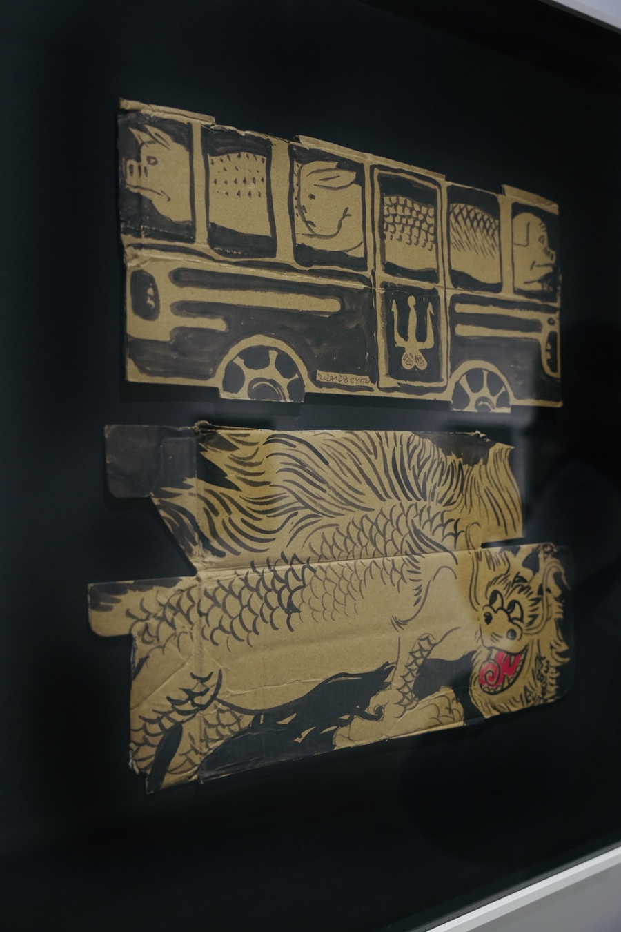 M50里举办的画展如此之多,最热闹的莫过于正在梵赫德画廊里举行的“点石成精——柴一茗个展”。相熟的朋友,不认识的过客,都愿意推门而入,与艺术家打个照面,与墙上的这些画作打个照面。生活中随处可见、随手抛弃的药盒、饼干盒、书籍腰封、快递包装盒……当老柴在信手拈来的物件上加入了他的奇思妙想,这些我们以为的“石”就真的“成精”了一般,从原本遭到废弃的状态中“炼”出了另一种常人不曾捉摸到的精神,令人意外,转念又会心一笑。