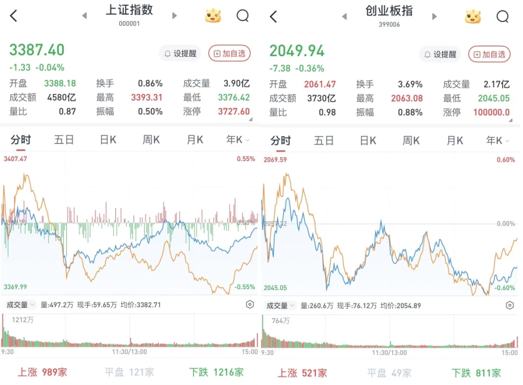 至收盘,上证综指跌0.04%,报3387.4点;科创50指数跌0.8%,报963.08点;深证成指跌0.12%,报10151.43点;创业板指跌0.36%,报2049.94点。