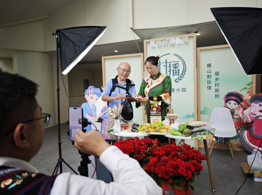 “拍下后次日从云南当地直发,这些都是来自云南原生态的产品,物美价廉。”现场,来自禄劝村播基地的两名工作人员身着民族风情服饰,通过互联网平台直播带货,“透过镜头不仅要卖出农产品,还要将禄劝县的土蜂蜜、野生菌、高山杂粮背后的乡村振兴故事告诉给市民游客。”