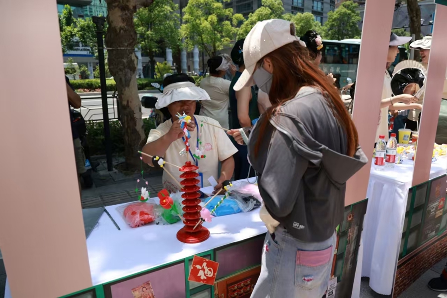 现场设置非遗文化展示区与弄堂游戏嘉年华两大核心板块。非遗展示区聚焦盘扣、面塑等传统技艺,不仅展示手工艺品的精巧工艺,更开放DIY体验区,让居民在动手实践中触摸非遗温度;糖画、麦芽糖、老冰棍等“旧时光市集”则以烟火气满满的场景,唤醒一代人的童年记忆。弄堂游戏嘉年华区里,跳房子、滚铁环、套圈等经典游戏吸引居民争相上场。