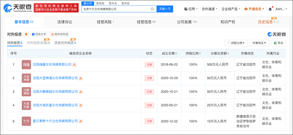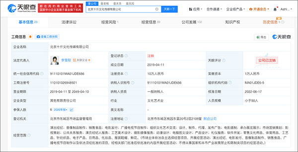 天眼查App显示,北京十斤文化传媒有限公司成立于2019年4月,法定代表人为李雪阳,注册资本10万人民币,经营范围包括演出经纪、音像制品制作、销售食品等,由上海酥年文化艺术策划合伙企业(有限合伙)、宁波唯猎投资管理合伙企业(有限合伙)共同持股,该公司已于2022年6月注销。对外投资信息显示,该公司全资持股5家企业,4家成立于2020年,1家成立于2018年,目前均已注销。