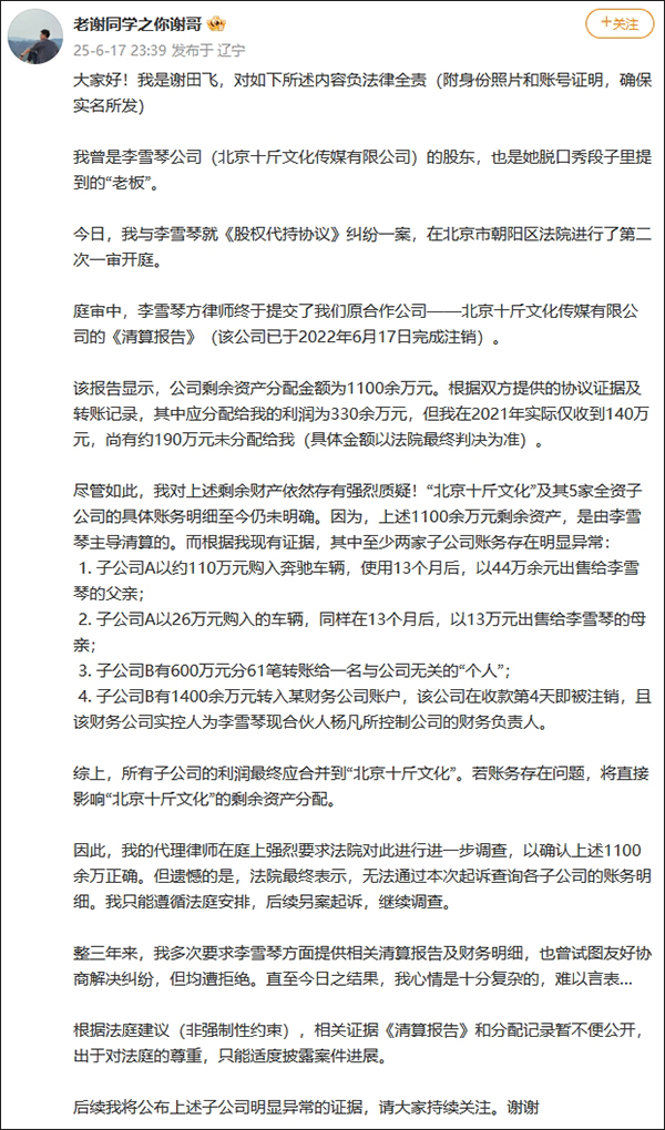 6月17日晚间,@老谢同学之你谢哥发布微博,自称“曾是李雪琴公司(北京十斤文化传媒有限公司)的股东”,实名举报该公司财务问题。