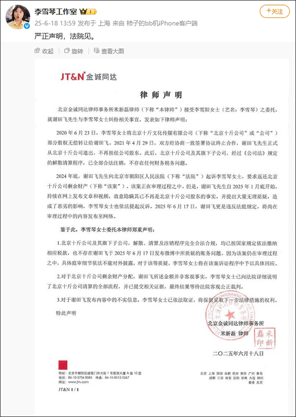 律师声明中称,北京十斤文化传媒有限公司及其旗下子公司解散、清算及注销程序完全合法合规,均已按国家规定依法缴纳相应税款,也不存在谢田飞于2025年6月17日发布微博中所质疑的账务问题。