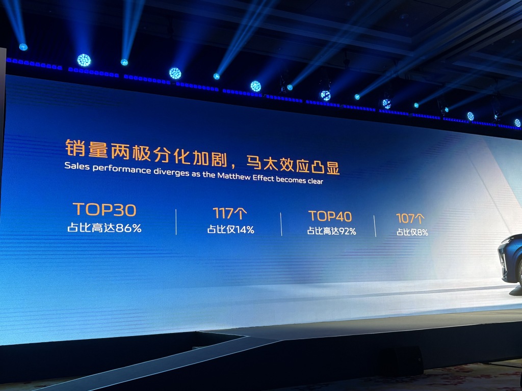 他还提到,中国汽车市场销量两极分化加剧,马太效应凸显。目前中国市场上有147个汽车品牌,共计提供840款产品。前30名的品牌的市占率高达86%,剩余117个品牌的市占率仅有14%;前40名的品牌市占率高达92%,剩余107个品牌则仅有8%的市占率。