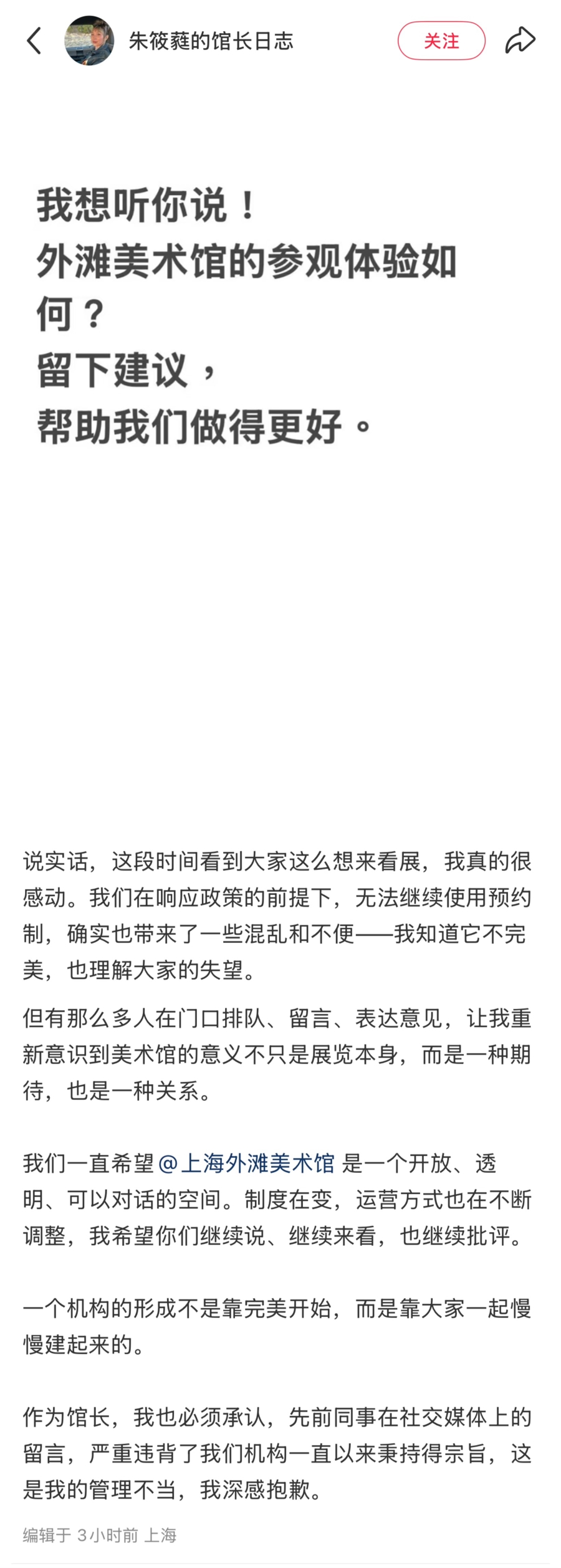 当天下午,“上海外滩美术馆”小红书账号以运营者个人身份发布了“来自美术馆账号皮下的一封信”,信中解释无论是线上预约还是取消预约改为线下直接入场模式,初衷都是为了优化参观体验,并表示“因为个人言论引起了反向效果,与美术馆的初衷相违背”,“已经认识到了这样做的不妥”。