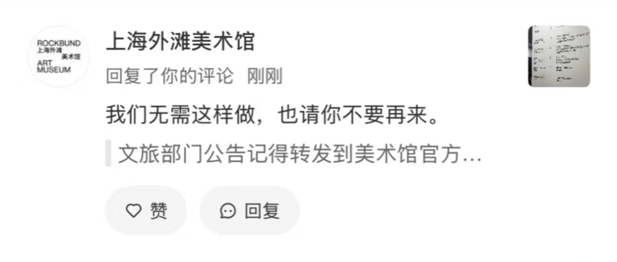 因小红书账号回复网友的一句“我们无需这样做,也请你不要再来”,上海外滩美术馆冲上舆论风口浪尖。