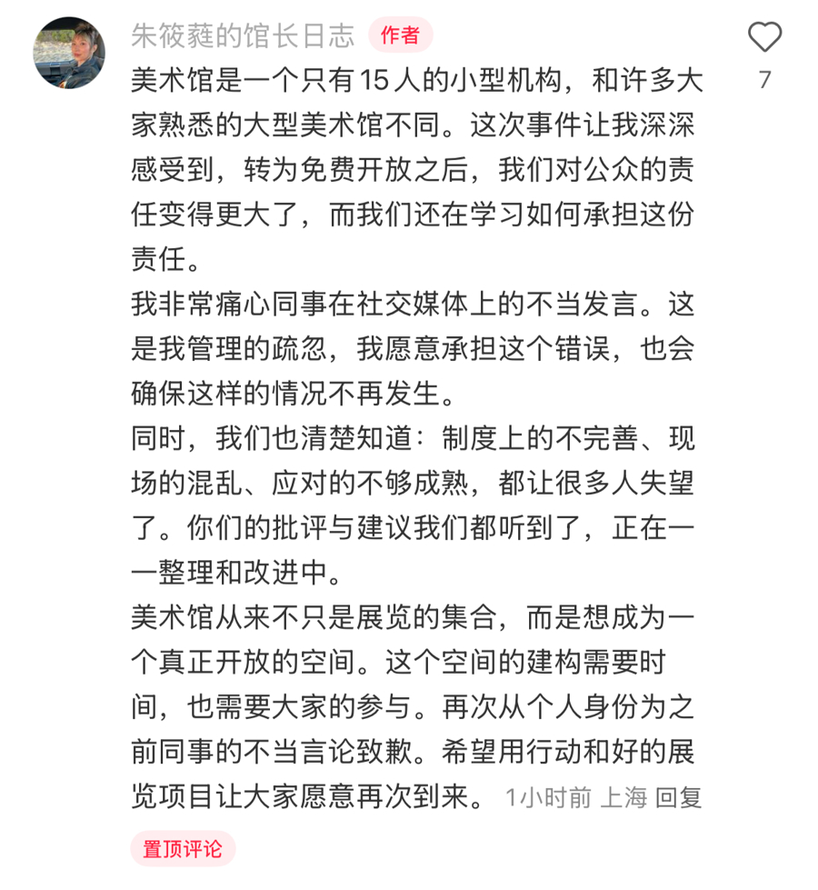 这封信发布后,因为只许好友评论、未以美术馆官方立场致歉等原因,并未取得网友对美术馆运营“混乱与傲慢”的谅解。