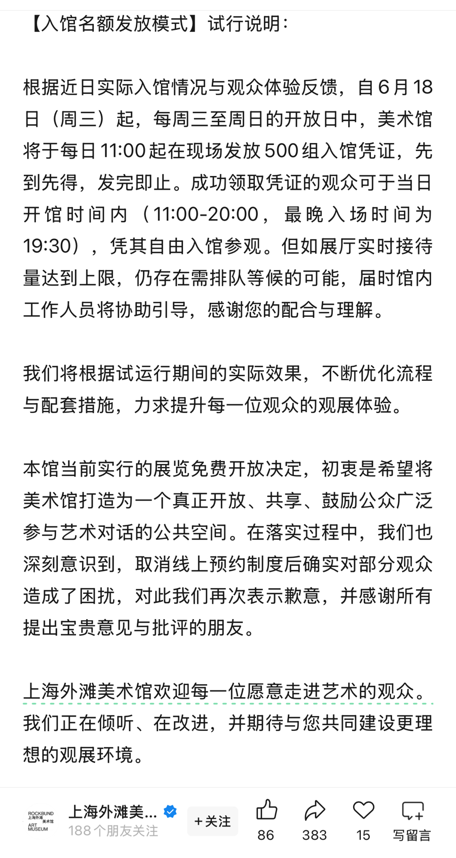 网上争议产生后,6月17日晚,上海外滩美术馆在《关于不当言论及入馆模式优化的公告》中向网友致歉,同时宣布6月18日起试行新的入馆模式,开放日每日11时起在现场发放500组入馆凭证,先到先得,发完即止。