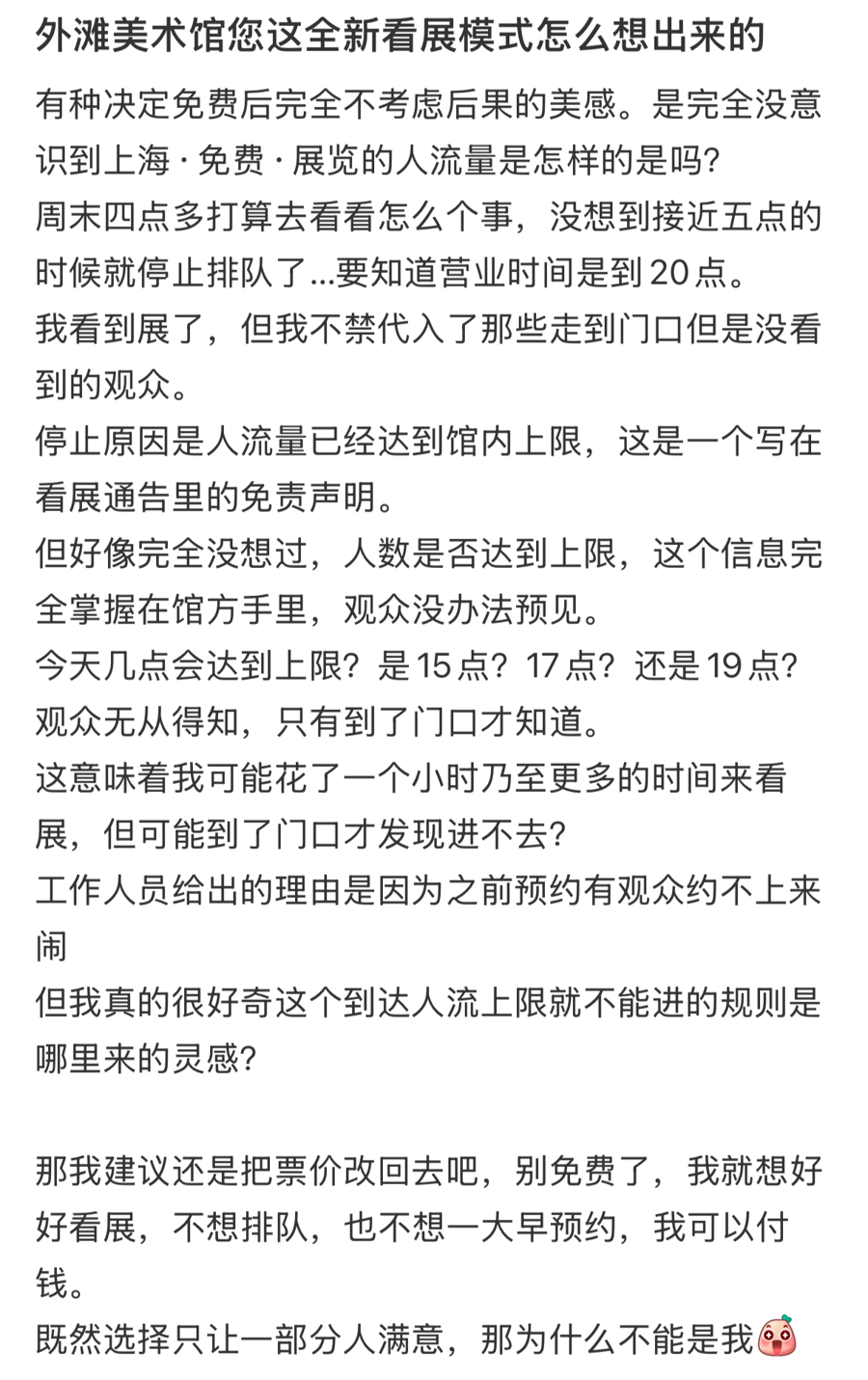 网友反映的“不良体验”是这样的:周末下午4点多打算去看展览,没想到接近5点的时候就停止排队了,要知道营业时间是到20点。停止原因是人流量已经达到馆内上限,这是写在看展公告里的免责声明。但几点会达到上限,参观者无从得知,只有到了门口才知道。这意味着有可能花了一个小时甚至更长时间来看展,到了门口才发现进不去。