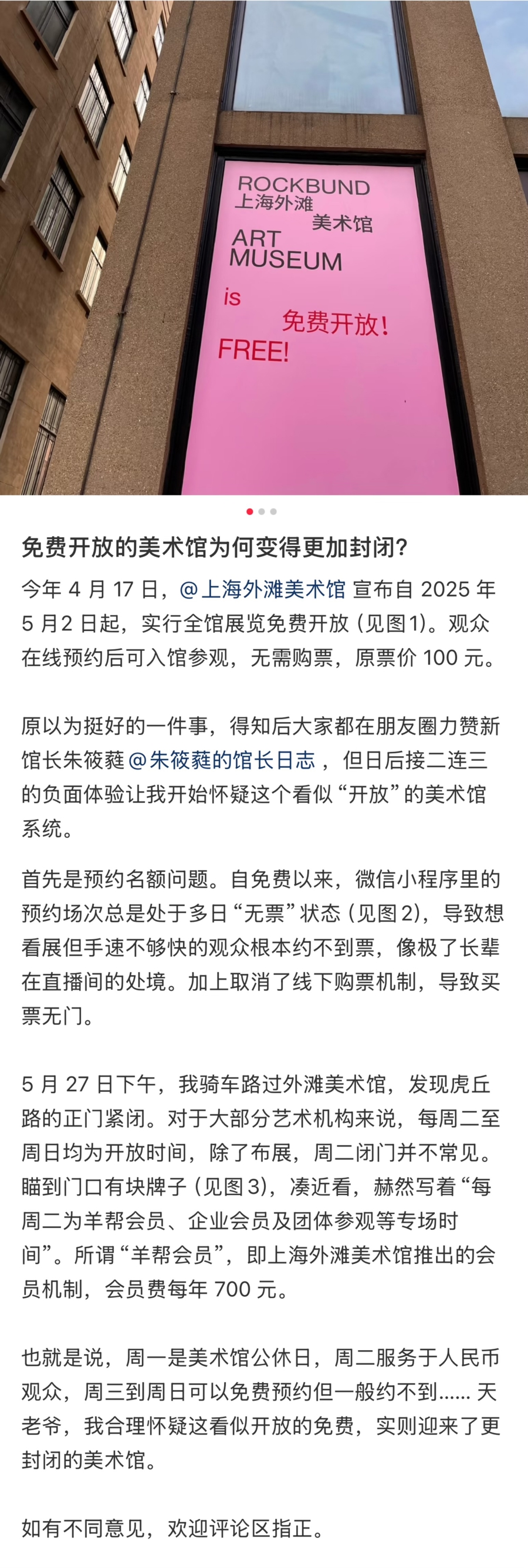 6月18日下午,上海外滩美术馆馆长通过个人账号表示,“转为免费开放后,对公众的责任更大了”。