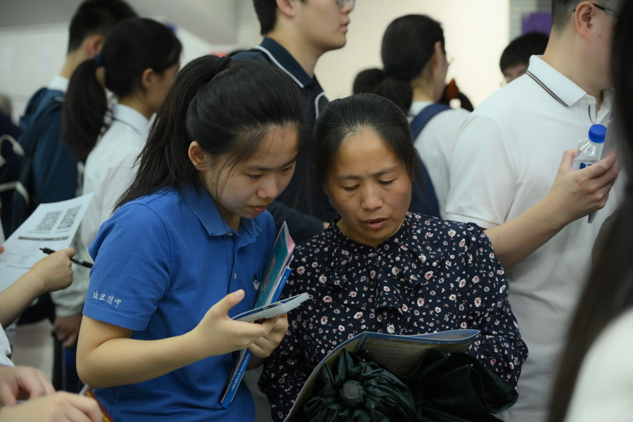 钱先生带着儿子一起前来。一圈咨询下来,钱先生收集了一打的材料。他说:“高考完之后,各个平台上的‘志愿填报指南’层出不穷,但信息质量参差不齐。学校这样直接的高校咨询会,直接把各高校负责招生的老师请到我们面前,这样一个直接的对话平台,可以让我们从招生官、教授等权威渠道获取真实、全面的信息。而且,面对面的交流,有一种‘量身定制’的感觉。”