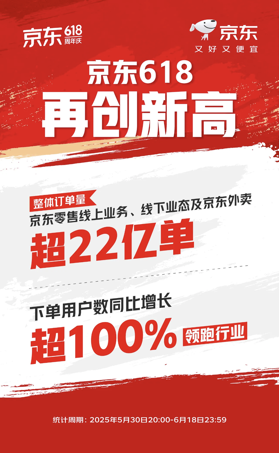 6月19日,记者从京东获悉,截至6月18日23:59,2025年京东618再创新高,下单用户数同比增长超100%领跑行业,京东零售线上业务、线下业态及京东外卖整体订单量超22亿单。