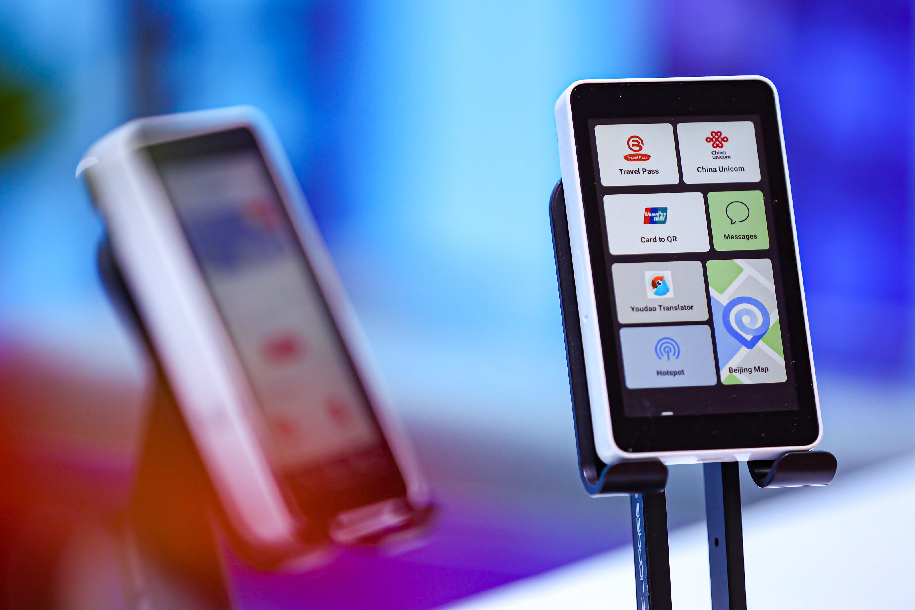 在展会现场,参观者可以操作“畅游通”实体机,体验扫码支付、翻译、地图等功能。