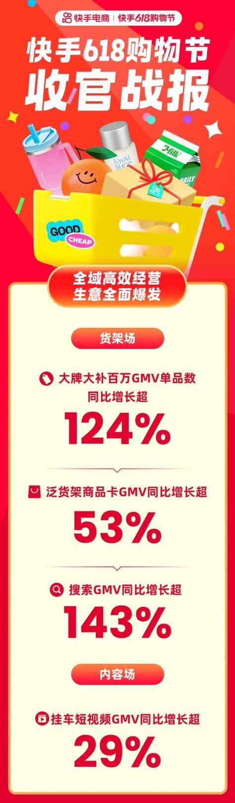 6月19日,快手电商发布2025快手618购物节收官战报,货架场持续高速增长,泛货架商品卡GMV同比增长超53%,搜索GMV同比增长超143%,快手商城大牌大补频道百万GMV单品数同比增长超124%,内容场消费繁荣,挂车短视频GMV同比增长超29%。