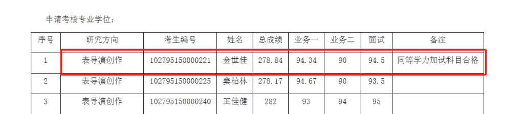 拟录取名单显示,表导演创作方向共录取三人,金世佳业务一科目成绩为94.34分,业务二科目成绩为90分,面试成绩为94.5分,同等学力加试科目合格,总成绩为278.84分。