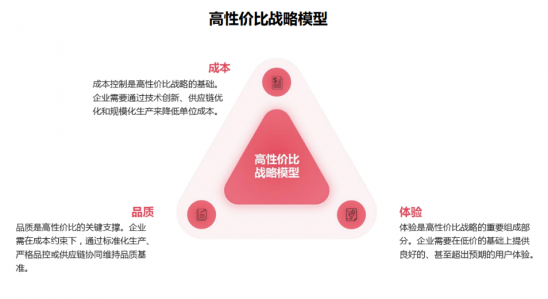 《报告》提炼了企业高性价比战略模型,即“成本-品质-体验”三角模型。罗钦形容,高性价比战略的可持续性法则建立在这一铁三角上,这也是企业实现长期竞争力的核心。其中,成本控制是高性价比战略的基础,品质是高性价比的关键支撑,体验则是高性价比战略的重要组成部分,企业可建立系统化的协同机制,通过持续迭代优化三者的配比关系,在动态平衡中实现高性价比战略的长期价值。