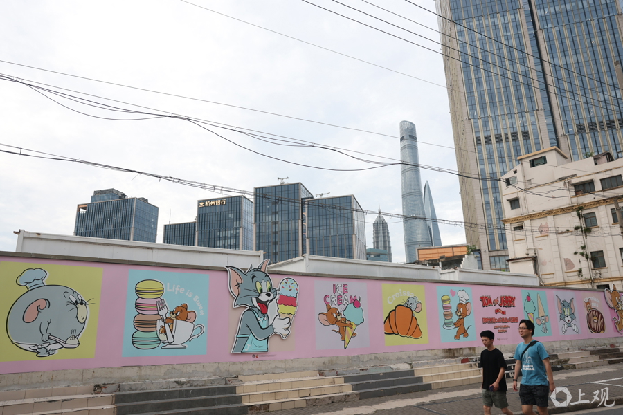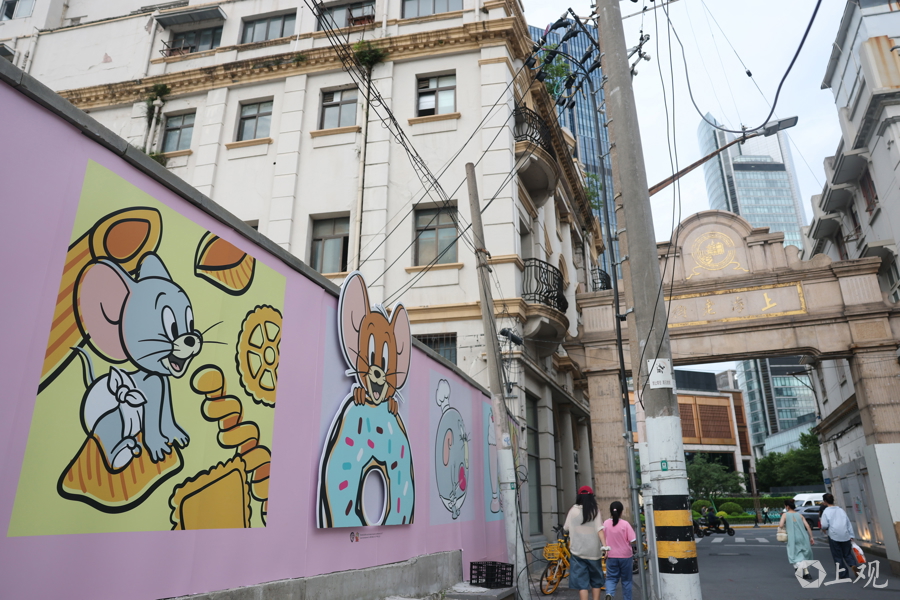 举着奶酪的杰瑞在前面跑,拿着球棒的汤姆在后面追;坐着滑翔机的汤姆从天而降,好心的杰瑞将黄色小鸟护在身后……黄浦大豫园片区内的方浜中路今天变身“猫和老鼠”主题街区。风靡全球的美国经典卡通《猫和老鼠》中的两位“主人公”走上了沿街两侧的旧改地块的外墙,勾起了很多“80后”“90后”的童年记忆,也带领市民游客从豫园穿越方浜中路来到外滩金融中心(以下简称BFC),一路走一路买,开启一场跨越经典与时尚的夏日休闲之旅。