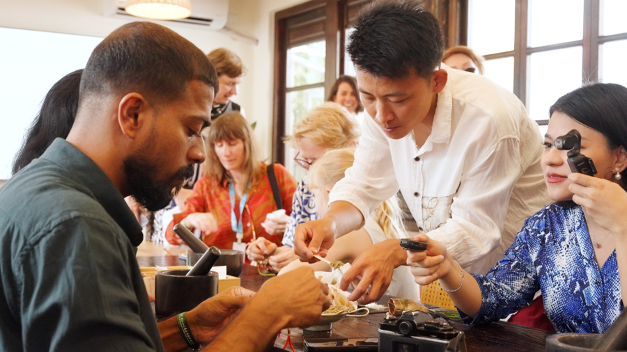 国际影人在新场古镇学习制作传统香囊。(周俊超 摄)