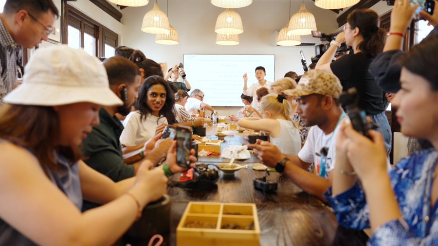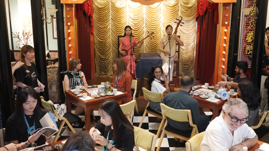 国际影人们在第一楼茶园感受评弹曲乐的魅力。(陈彦锴 摄)