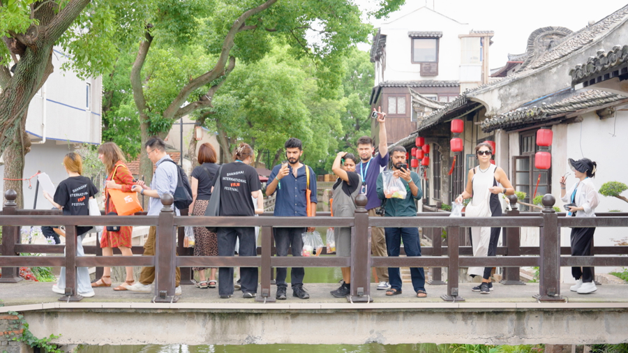 国际影人在新场古镇的小桥上拍照留念。(王竟成 摄)