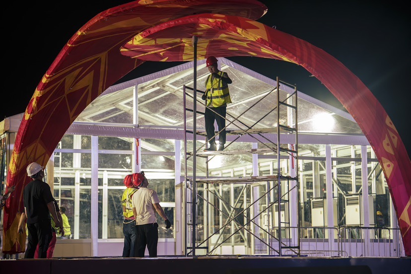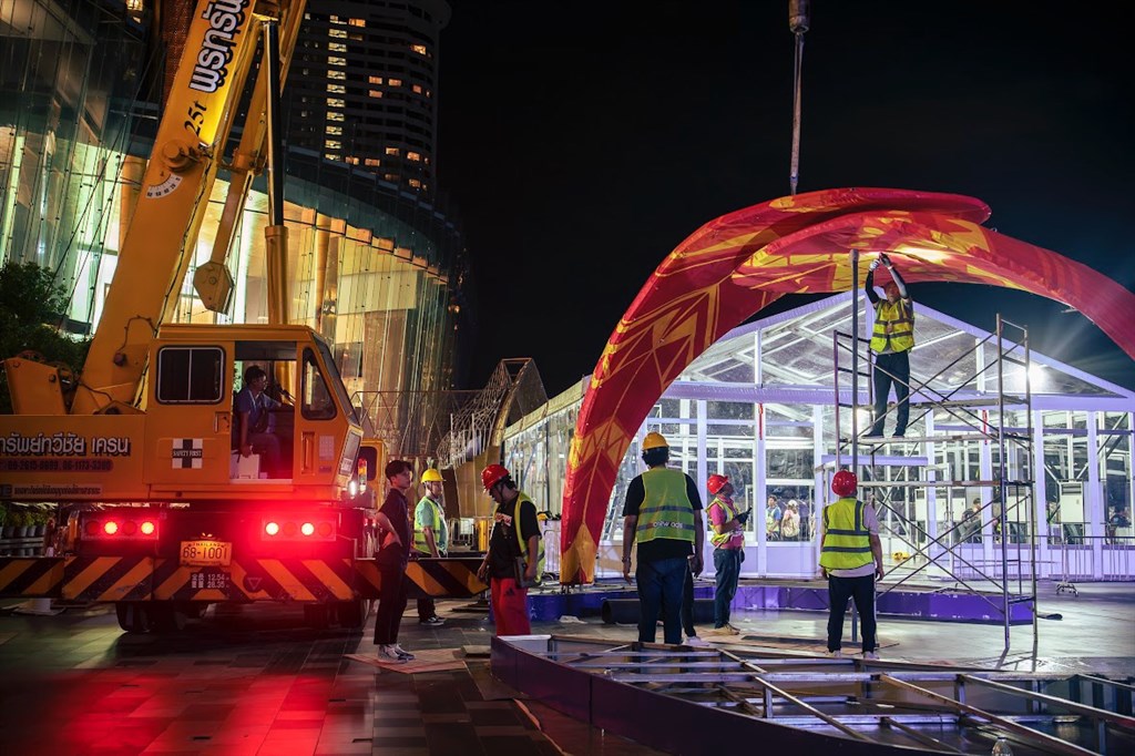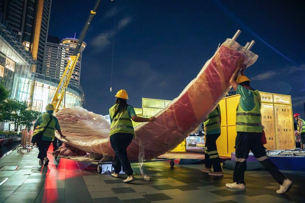 东方网记者程琦6月21日报道:豫园灯会走出国门又有了新进展。 2025泰国豫园灯会即将于6月28日晚在曼谷著名商业地标暹罗天地ICONSIAM正式亮灯,献礼中泰建交50周年。日前,多达11个集装箱的灯彩作品已运抵曼谷,并加紧进行组装搭建。6月20日,记者从泰国豫园灯会主办方豫园股份处获悉,2025泰国豫园灯会灯组安装进度已近50%,主舞台灯组、中泰友谊之花灯组、白泽灯组等多个核心大型灯组均已完成组装。