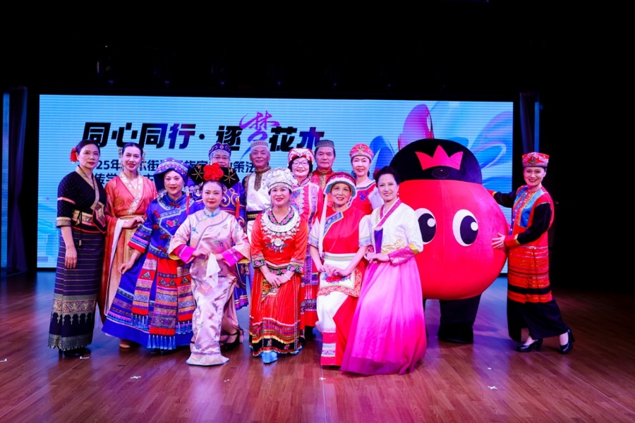舞台上,多元文化碰撞出惊艳火花。民族服饰队以《步步生花》走秀演绎“衣冠上的史诗”,汉绣唐装与维吾尔艾德莱斯绸同台生辉;国际吉他大师段昌武与卡德尔餐厅厨师联合弹唱《一路生花》,灶台前的民间歌者与享誉世界的艺术家,用吉他共谱“专业与热爱、殿堂与烟火”的融合乐章;童声合唱《民族小小花园》将“民族小花”种进观众心田,稚嫩歌声唱响“中华民族大家庭”的纯真愿景。