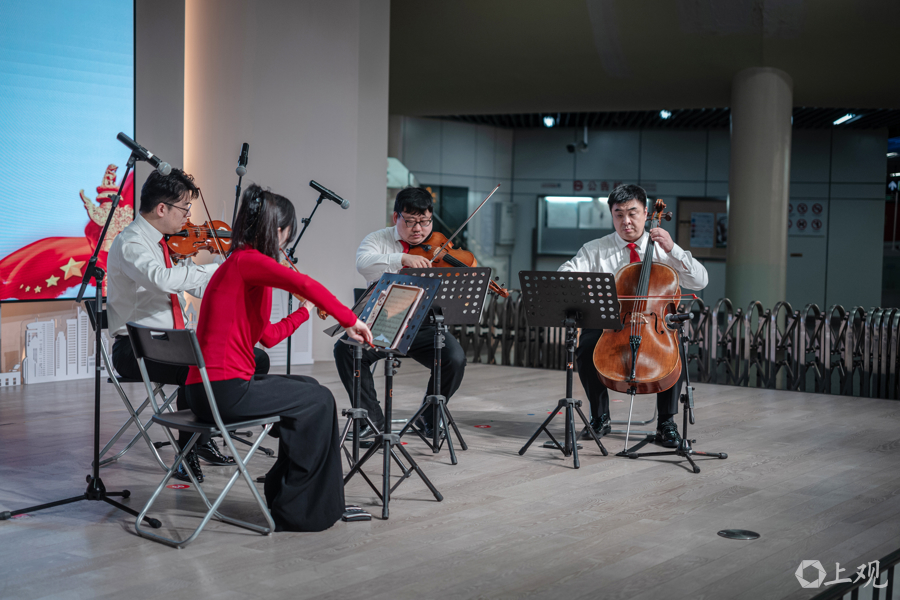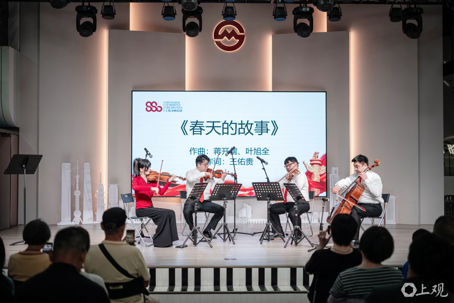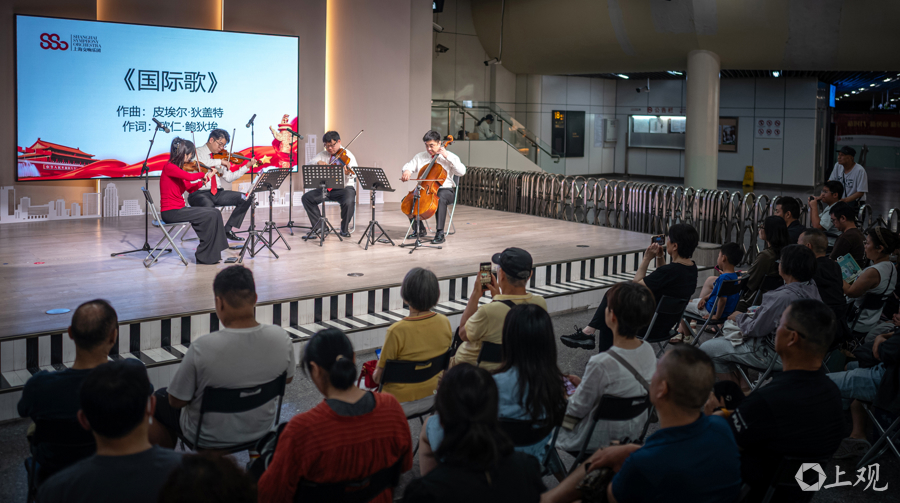 2025年6月22日下午2点,人民广场地铁站换乘通道的音乐角传来悠扬乐声。上海交响乐团北极星四重奏以边讲解边演出的形式,为来往市民带来"百年初心"主题文艺党课,用《唱支山歌给党听》《我和我的祖国》等红色经典旋律致敬建党104周年。