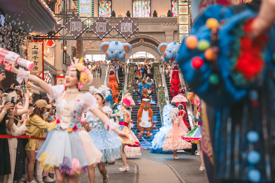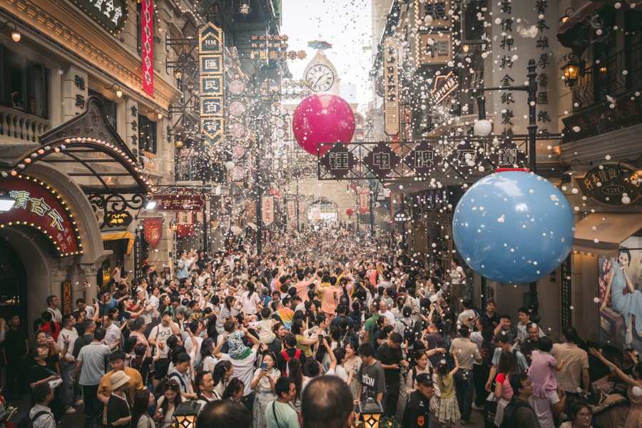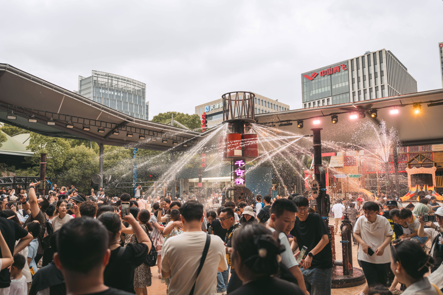 步入上海千古情景区,穿越古今,全园有戏。穿越街化作斑斓的海洋,巨大的彩色气球从天而降,威尼斯主题多巴胺狂欢在这里开启。漫天飞舞的梦幻泡泡,与孩童们被瞬间点燃的清脆欢笑交织共舞。演出《上海千古情》演绎上海传奇,景区内的实景剧《大地震》《我是主角》等,交织成一幅活力四射的沉浸式狂欢画卷。森林剧场里,《仲夏夜之梦》悄然上演,为喧嚣增添几分诗意。水花漫天飞洒,朋克泼水狂欢一秒破除蒸煮模式,送来一夏清凉。整个上海千古情景区沉浸在盛大的穿越狂欢之中。