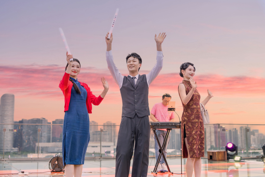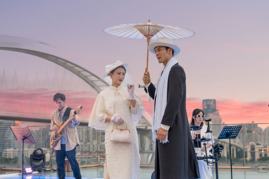 在景区的顶楼悬崖剧院,黄浦江风拂面而来。游客们与“许文强”“冯程程”“书桓”“依萍”“雪姨”等共同唱响《上海滩》《情深深雨濛濛》等脍炙人口的影视剧歌曲。歌声中,时空交错,将人瞬间拉回风云际会的上海滩。滔滔江水在悬崖剧院下奔腾而过,游客与黄浦江的距离仿佛只有 0.01米。一位来自韩国的游客说:“《悬崖落日音乐会》让我真切触摸到了上海的文化脉搏,原来这就是‘海纳百川’的韵味。”