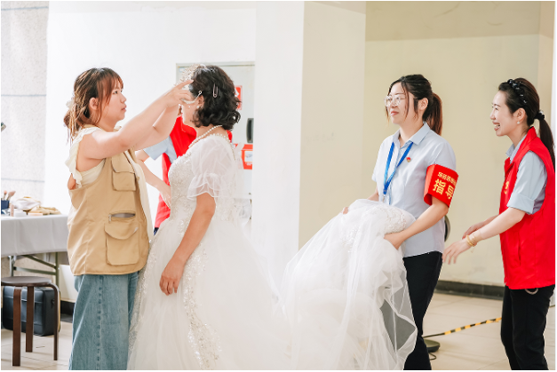 身穿红马甲的志愿者穿梭于各个服务区域,“党员示范岗”的红色标识在“银龄”婚纱服务的化妆间中格外醒目。“定格岁月·重温浪漫”主题活动,党员、青年志愿者、项目思政指导员全程陪同10余对老年夫妇挑选礼服、整理妆容。70岁的张爷爷握着妻子的手感慨:“结婚40年,第一次穿上西装拍婚纱照,感谢物业圆了我们的梦!”这种“服务+陪伴”的模式,让红色服务网络真正延伸到银发群体的生活细节。