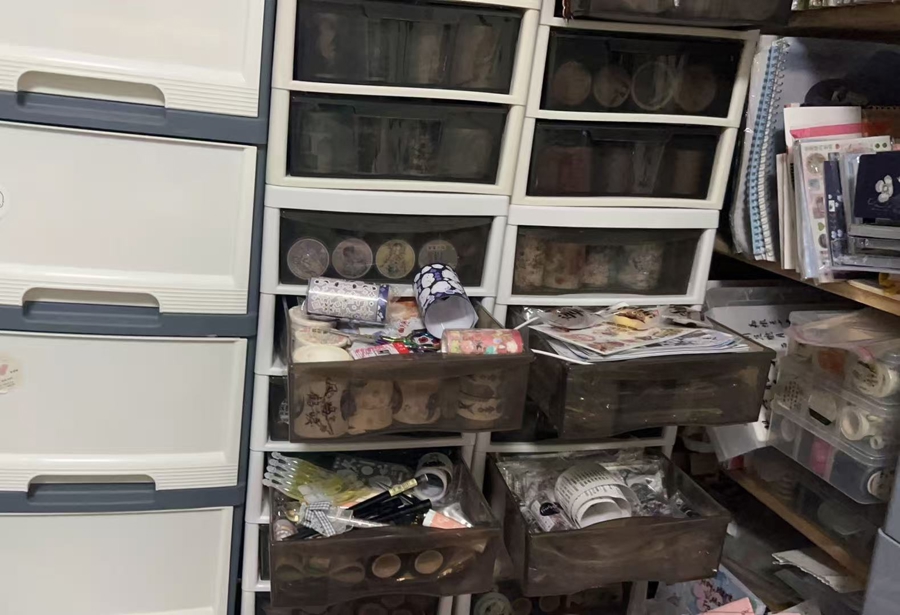 00后上海女孩妮娜2019年掉进了手帐的“坑”。“一开始,阳台有一个角落专门放本子和胶带印章,后来东西实在太多,现在一整面通顶的柜子都放着我的‘战利品’。”