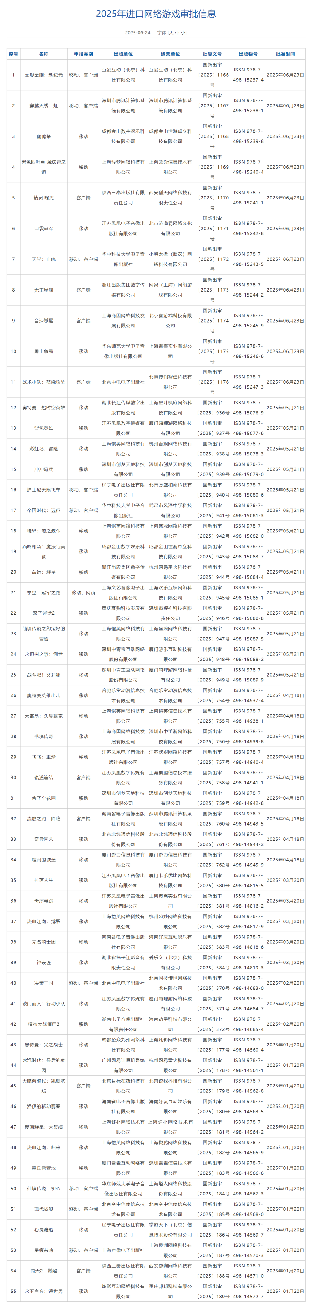 (原标题:《2025年6月份国产网络游戏审批信息》《2025年进口网络游戏审批信息》)